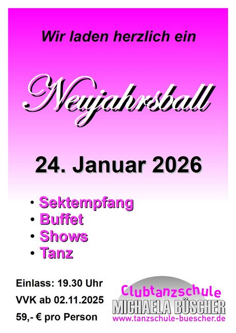 Der Kartenvorverkauf und Tischreservierung startet am 02.11.2025 in der Tanzschule zum Preis von 59,- € pro Karte.